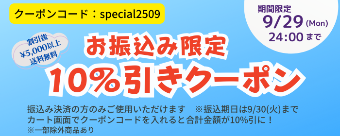 ※ 割引前の金額が5,000円以上の場合自動的に送料無料となりますが、割引後に5,000円未満になる場合は送料無料対象外となり、注文後ショップにて送料を加算させていただきます